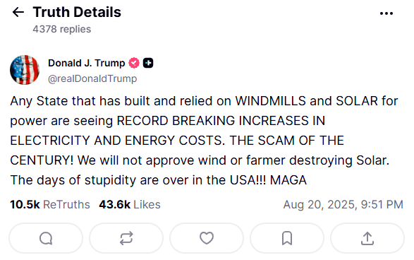 “我們不會再批準(zhǔn)破壞農(nóng)田的風(fēng)電或光伏項目。”特朗普在“直相社交”上發(fā)帖稱,他過去曾抱怨太陽能占用了太多土地。“美國的愚蠢時代已經(jīng)結(jié)束了!!!”