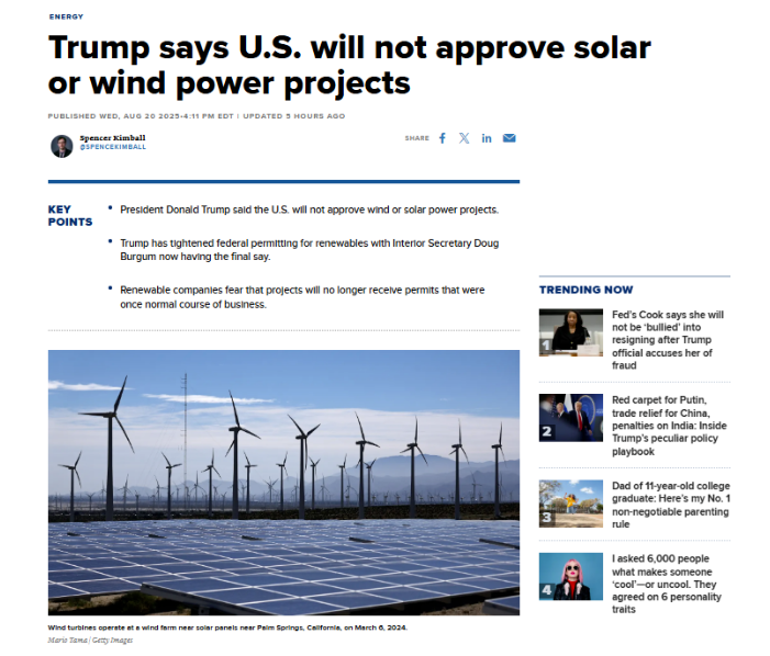 可再生能源公司擔(dān)心,原本正常的項目未來無法再獲得許可,“總統(tǒng)周三的言論可能會加劇這些擔(dān)憂。”