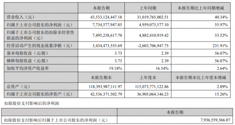 同日,陽光電源發(fā)布2025年半年度報告。上半年陽光電源實現(xiàn)營業(yè)收入435.33億元,同比增長40.34%;實現(xiàn)歸屬于上市公司股東的凈利潤77.35億元,同比增長55.97%。擬向全體股東每10股派發(fā)現(xiàn)金股利9.50元(含稅)。