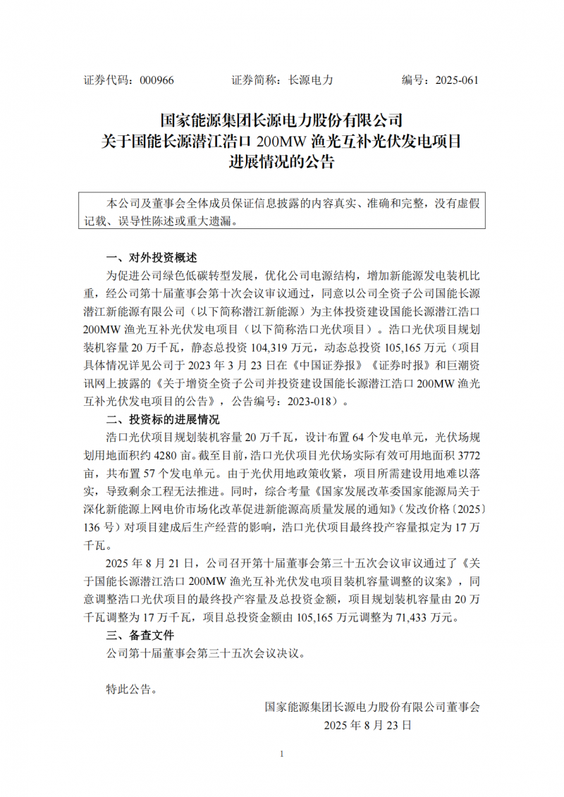 2025年8月21日,長源電力召開第十屆董事會第三十五次會議審議通過了《關(guān)于國能長源潛江浩口200MW漁光互補(bǔ)光伏發(fā)電項(xiàng)目裝機(jī)容量調(diào)整的議案》,同意調(diào)整浩口光伏項(xiàng)目的最終投產(chǎn)容量及總投資金額,項(xiàng)目規(guī)劃裝機(jī)容量由20萬千瓦調(diào)整為17萬千瓦,項(xiàng)目總投資金額由105,165萬元調(diào)整為71,433萬元。