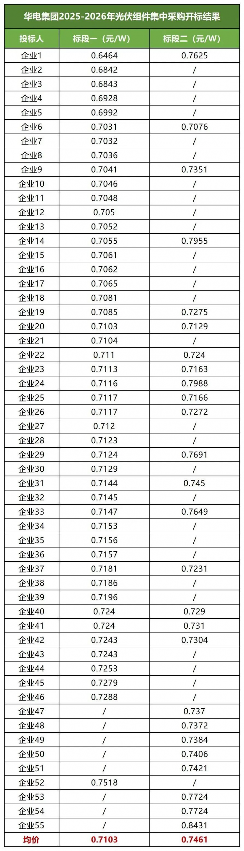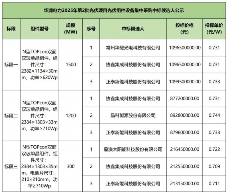 8月18日開標的華潤3GW光伏組件集采同樣如此,三個標段均價均都在0.7元/W以上,顯著高于當前市場水平。根據(jù)此前發(fā)布的中標候選人公示,常州華耀光電、協(xié)鑫、晶澳、晶科、正泰五家企業(yè)入圍,投標單價0.709~0.744元/W。
