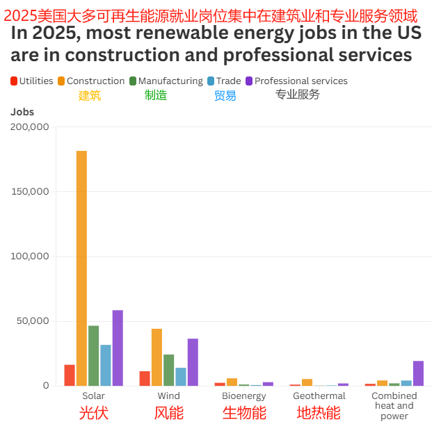 這一數(shù)據(jù)出自最新發(fā)布的《美國清潔就業(yè)年度報(bào)告》。該報(bào)告強(qiáng)調(diào),過去五年美國清潔能源行業(yè)共新增約52萬個(gè)崗位,尤其是2024年,可再生能源新增崗位占比超過82%。其中,又以太陽能行業(yè)表現(xiàn)最為突出,其崗位數(shù)接近化石燃料發(fā)電的兩倍,是風(fēng)能行業(yè)的近三倍。