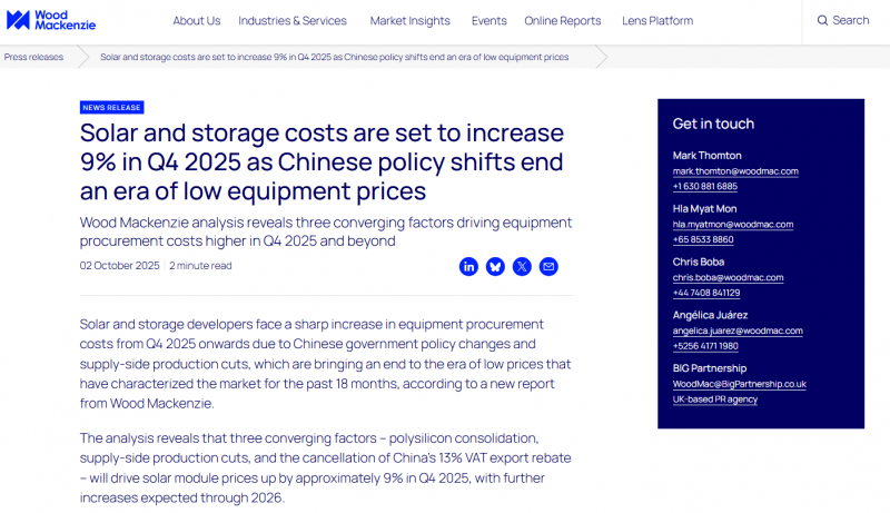 此外,自2025年第四季度起,中國預(yù)計將取消對太陽能電池組件和儲能出口的13%增值稅退稅,這將是第三個決定性因素。伍德麥肯茲解釋說,由于中國供應(yīng)了全球超過80%的太陽能電池組件和90%的儲能用磷酸鐵鋰電池組,退稅的取消將推高全球基準(zhǔn)價格。