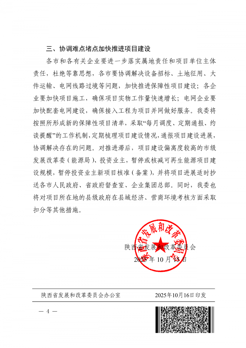 3.2024年度新能源項目。各投資主體應加快2024年度新能源項目前期工作,對于2025年12月底前未取得備案手續(xù)的光伏項目,2026年6月底前未取得核準的風電項目,納入廢止項目清單,各市經公示5個工作日后報送我委。對于按時完成核準備案手續(xù)的項目,光伏項目并網時間延期至2027年12月底,風電項目并網時間延期至2028年6月底。對于延期后仍不能按期建成并網的項目,不得再次延期,項目自動作廢。