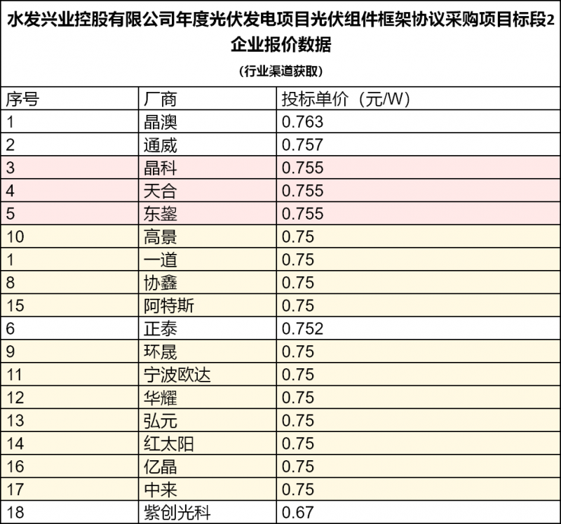 從此次項目的投標數(shù)據(jù)來看,從公示信息來看,此次投標單價集中在0.75-0.763元/W區(qū)間。