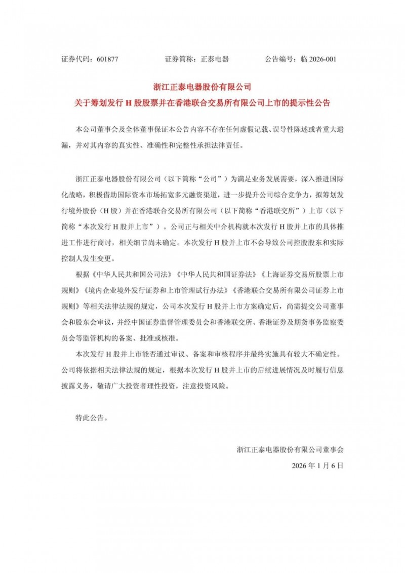 1月5日晚間,正泰電器發(fā)布公告稱,公司為滿足業(yè)務(wù)發(fā)展需要,深入推進(jìn)國(guó)際化戰(zhàn)略,積極借助國(guó)際資本市場(chǎng)拓寬多元融資渠道,進(jìn)一步提升公司綜合競(jìng)爭(zhēng)力,擬籌劃發(fā)行境外股份(H股)并在香港聯(lián)合交易所有限公司(以下簡(jiǎn)稱“香港聯(lián)交所”)上市。