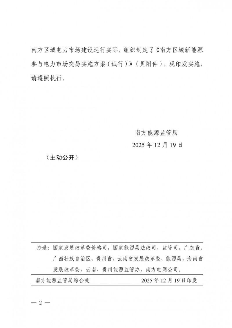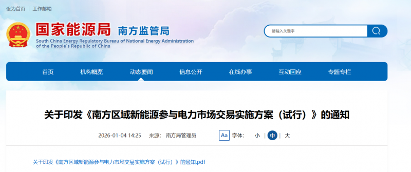 1月4日,國(guó)家能源局南方監(jiān)管局發(fā)布關(guān)于印發(fā)《南方區(qū)域新能源參與電力市場(chǎng)交易實(shí)施方案(試行)》的通知,明確了南方區(qū)域新能源參與現(xiàn)貨、中長(zhǎng)期電能量市場(chǎng)以及綠色電力交易的方式和要求。