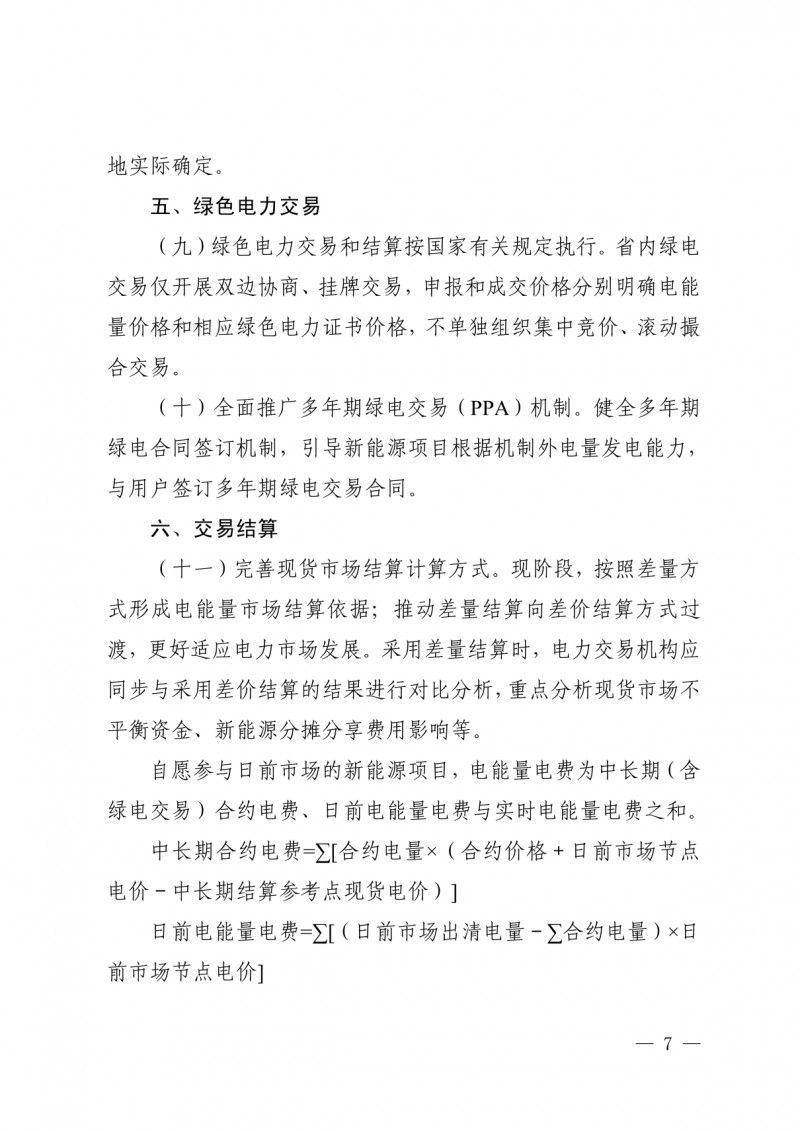 綠色電力交易和結(jié)算方面,按國(guó)家有關(guān)規(guī)定執(zhí)行。省內(nèi)綠電交易僅開展雙邊協(xié)商、掛牌交易,申報(bào)和成交價(jià)格分別明確電能量?jī)r(jià)格和相應(yīng)綠色電力證書價(jià)格,不單獨(dú)組織集中競(jìng)價(jià)、滾動(dòng)撮合交易。
