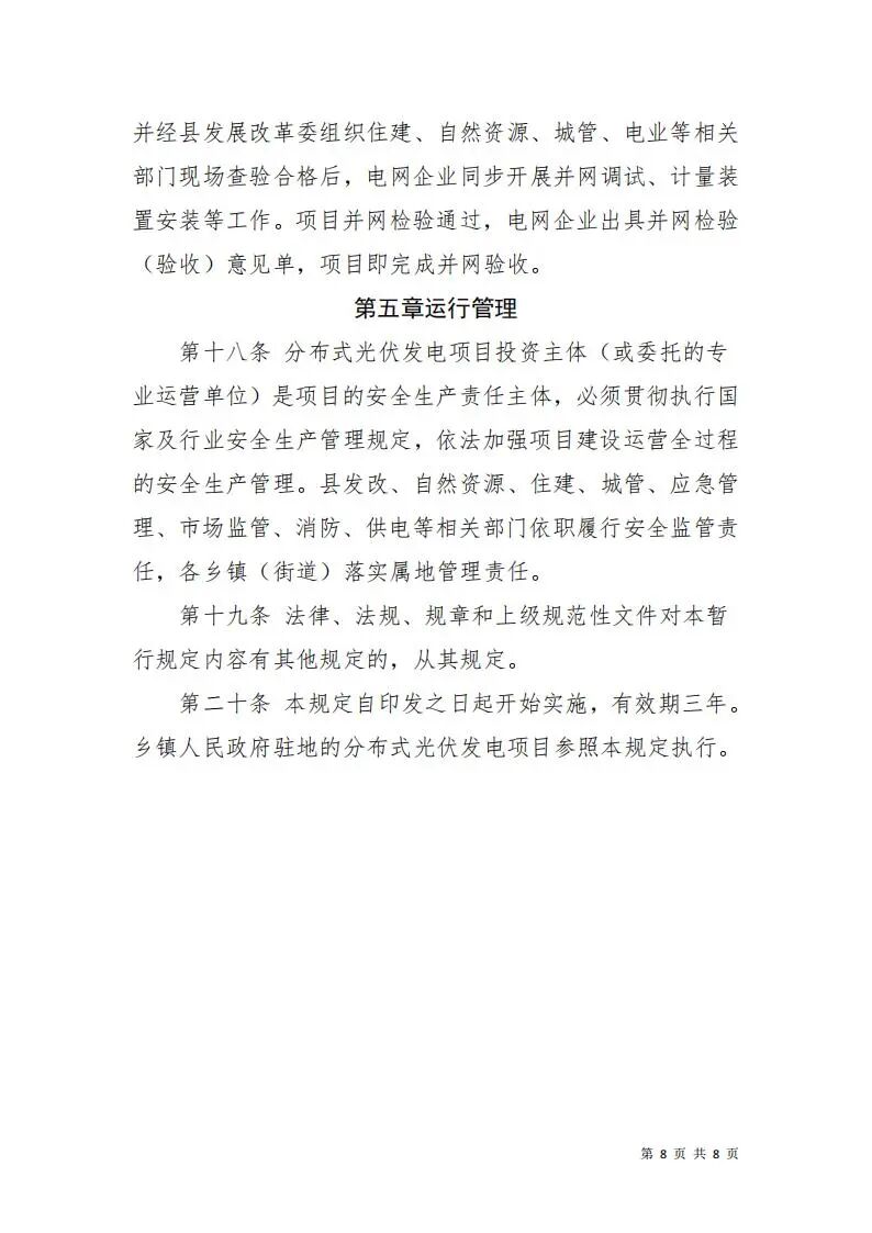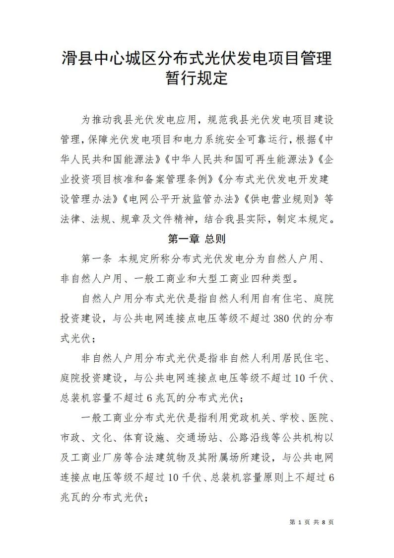 為規(guī)范管理我縣中心城區(qū)分布式光伏發(fā)電項目,促進(jìn)光伏產(chǎn)業(yè)健康有序發(fā)展,縣發(fā)展改革委組織相關(guān)部門起草了《滑縣中心城區(qū)分布式光伏發(fā)電項目管理暫行規(guī)定》,目前已完成前期研討和初步論證。為廣泛聽取社會各界的意見和建議,進(jìn)一步提高規(guī)范性文件制定的科學(xué)性和民主性,經(jīng)報請縣人民政府同意,現(xiàn)將《滑縣中心城區(qū)分布式光伏發(fā)電項目管理暫行規(guī)定》全文予以公示。