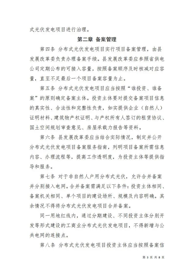 文件指出,分布式光伏發(fā)電項目實(shí)行項目備案管理,由縣發(fā)展改革委負(fù)責(zé)辦理備案手續(xù)。縣發(fā)展改革委應(yīng)參照省供電公司定期公布的可接入容量,按照備案順序及時核減對應(yīng)容量,直至不足最后一個項目備案容量為止。
