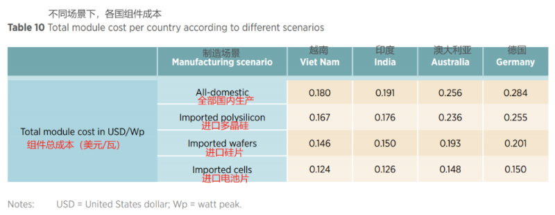 報(bào)告中明確提到:“在大多數(shù)情況下,純國(guó)內(nèi)生產(chǎn)成本較高,尤其與從低成本市場(chǎng)進(jìn)口零部件相比。成本下降最大的場(chǎng)景是進(jìn)口太陽(yáng)能電池,并在本地進(jìn)行光伏組件組裝,這凸顯了現(xiàn)有制造中心目前的價(jià)格優(yōu)勢(shì)。”