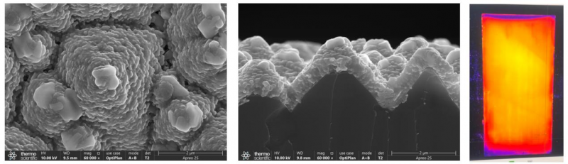 圖示:上海葉爍制備鈣鈦礦-晶硅疊層電池,毯式覆蓋的鈣鈦礦層SEM&PL圖
