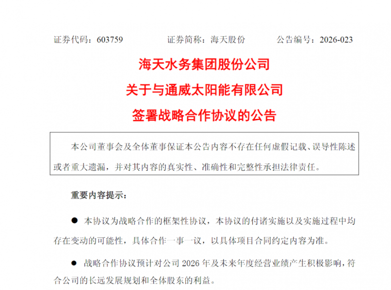 海天股份表示,此次合作契合公司綠色低碳轉(zhuǎn)型戰(zhàn)略,預(yù)計(jì)對(duì)公司未來(lái)年度經(jīng)營(yíng)業(yè)績(jī)產(chǎn)生積極影響。另外提示,本協(xié)議屬于戰(zhàn)略合作的框架性協(xié)議,在實(shí)施本協(xié)議及其過(guò)程中,均可能存在變動(dòng)的情況。具體合作將一事一議,以具體項(xiàng)目合同中約定的內(nèi)容為準(zhǔn)。