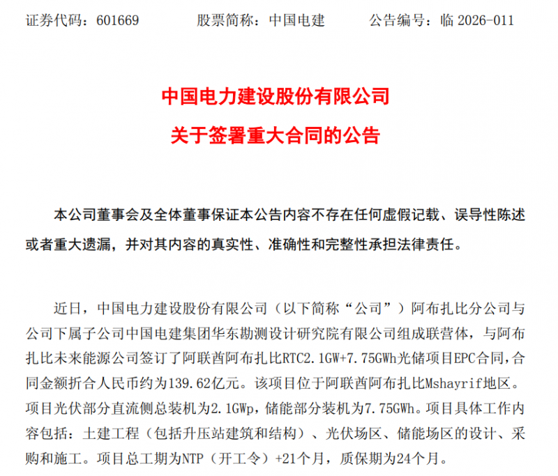 此前,中國(guó)電建曾披露,公司阿布扎比分公司與公司下屬子公司中國(guó)電建集團(tuán)華東勘測(cè)設(shè)計(jì)研究院有限公司組成聯(lián)營(yíng)體,與阿布扎比未來(lái)能源公司簽訂了阿聯(lián)酋阿布扎比RTC2.1GW+7.75GWh光儲(chǔ)項(xiàng)目EPC合同,合同金額折合人民幣約為139.62億元。