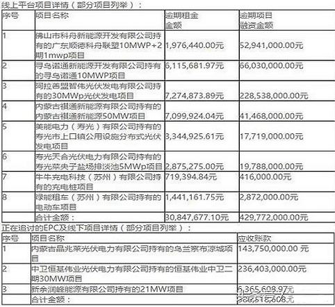 5月9日,綠能寶在官網(wǎng)公布了它的“楊白勞”名單,并宣稱通過法律手段追討EPC(工程設(shè)計、采購、施工總承包)及線下項目欠款,預(yù)計總額3.9億元。此外,線上平臺承租人逾期未支付的正常租金、正常售后回租的到期及逾期項目,合計金額3085萬元。兩項合計,總額4.3億元。
