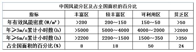 根據(jù)全國氣象臺部分風能資料的統(tǒng)計和計算,中國風能分區(qū)及占全國面積的百分比。