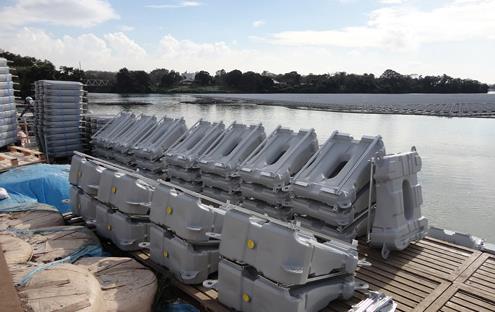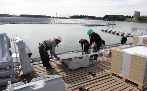 電池板設置作業(yè),先要在陸地上將電池板安裝在浮體式架臺上,將連接14張電池板的陣列(電池板設置單位),用船拖至水上的電池板設置場所(水上漂浮的太陽能電池板)后,再行連接。