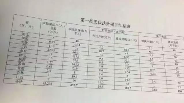 第一批光伏扶貧省份共有11個(gè)。其中:山東1.17GW、江西790MW、安徽750MW、山西460MW、河北400MW、吉林390MW、湖北273MW、陜西269.2MW、云南123.4MW、河南105.1MW、甘肅80MW。