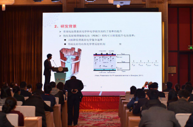 演講先由PERC的研發(fā)背景引入:“常規(guī)電池背表面光學(xué)和電學(xué)損失制約了效率的提升,而鈍化發(fā)射極背接觸電池(PERC)結(jié)構(gòu)可大幅度提升電池效率:1、大幅降低背表面電學(xué)復(fù)合速率2、形成良好的內(nèi)部光學(xué)背反射機(jī)制。”然后在談到到公司PERC電池的工藝路線時(shí),他說:PERC電池的工藝路線比普通電池片的工藝路線要多了兩道工藝,技術(shù)風(fēng)險(xiǎn)低,可以使電池片效率大大提高!”