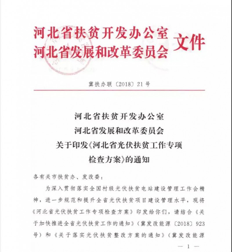 據悉,河北省扶貧辦、河北省發(fā)改委于近日聯合“《河北省光伏扶貧工作專項檢查方案》的通知”,要求于8月底前在全省有光伏扶貧任務的9個區(qū)市和41個縣全面開展專項檢查。