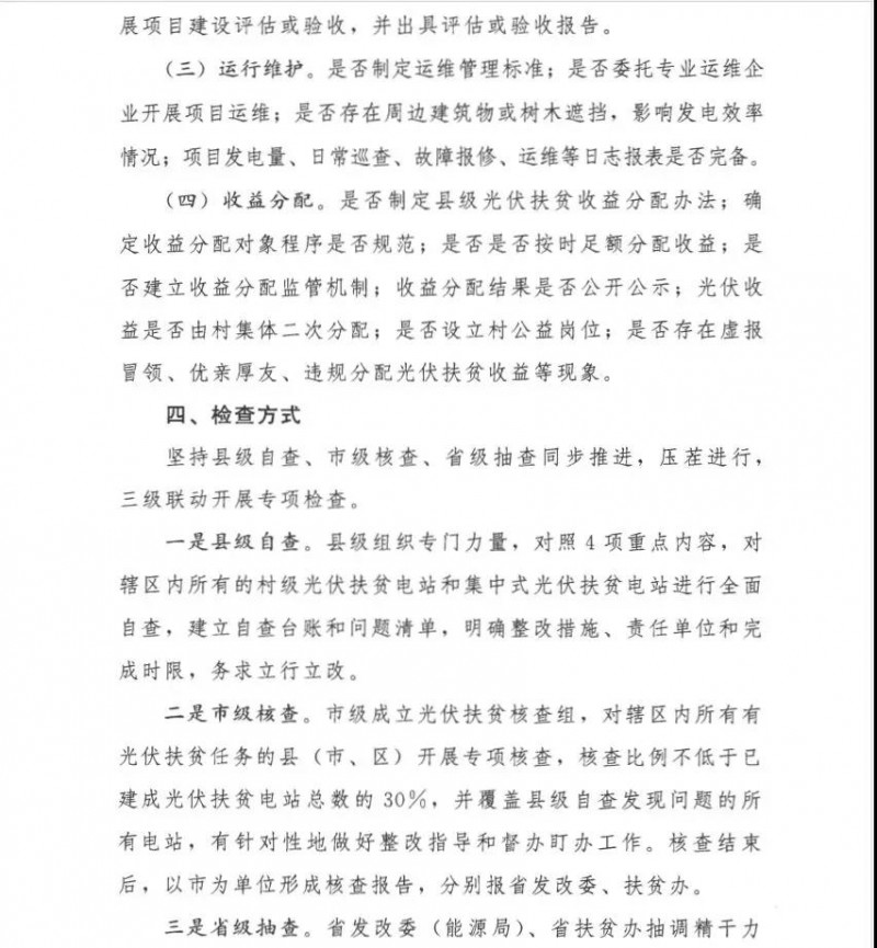 此次將重點檢查村級光伏扶貧電站和集中式光伏扶貧電站,主要內容包括組織推動、工程質量、運行維護、收益分配等,要求各地組織自查,同時上級部門開展核查和抽查,進行三級聯動式專項檢查。