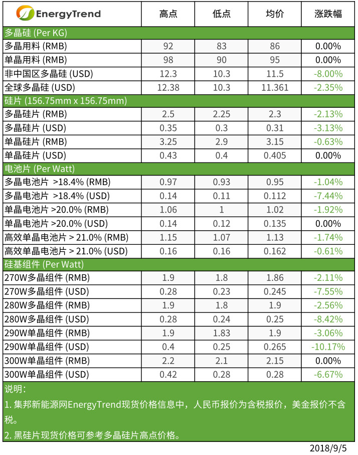 本周硅料供需大致維持平盤。大陸國內(nèi)9月份仍有將近2000噸的供應(yīng)量因檢修而減少,但是也有廠家恢復(fù)生產(chǎn),一來一往之下,預(yù)估整月供給量與8月份相差不大,因而可以維持價格平穩(wěn)甚至有向上調(diào)整的可能。目前大陸國內(nèi)多晶用硅料維持RMB83-92/KG,單晶用硅料依舊維持不變在RMB90~98/KG的價位。海外硅料料則因為大陸需求減少,長單的議價空間對變大,價格已受影響,目前價格落至US$10.3-12.3/KG,均價落至US$11.5/KG。