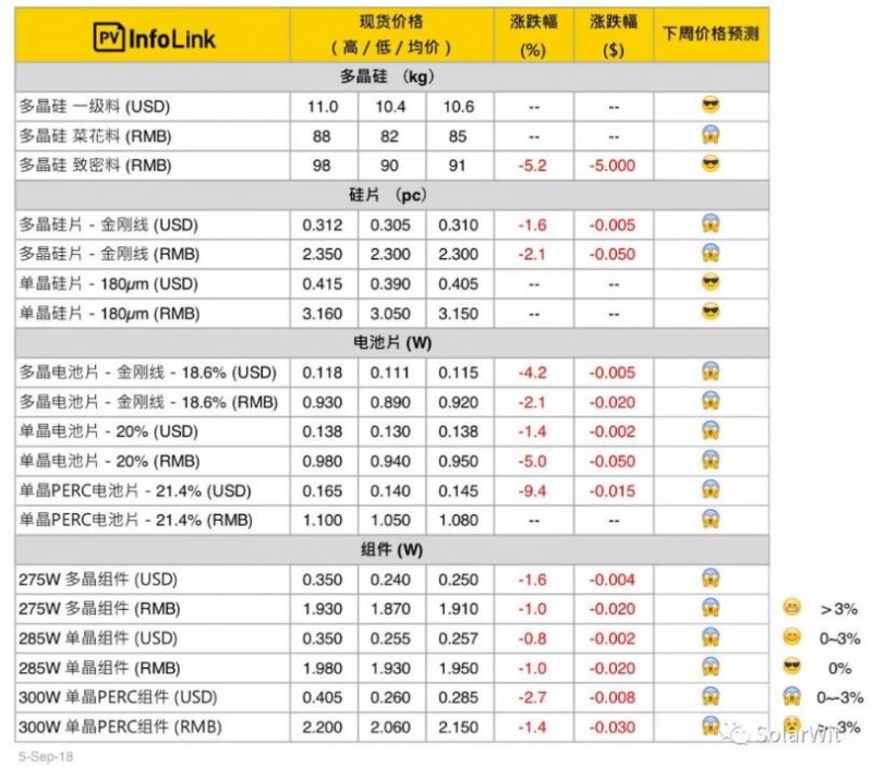 9月3日歐盟決定不在延長MIP雙反措施,當(dāng)國內(nèi)光伏企業(yè)歡呼雀躍,大呼自己的產(chǎn)能迎來新的出??诘耐瑫r,臺灣的電池業(yè)者可能怎么也高興不起來,得益于貿(mào)易保護(hù)措施,東南亞地區(qū)的電池產(chǎn)能一直享受著區(qū)位布局帶來的超額收益,就以上半年歐洲地區(qū)為例,2018年H1出口歐洲地區(qū)的組件均價依然維持在36歐分(折合42美分)的高位,而現(xiàn)在貿(mào)易保護(hù)措施取消,國內(nèi)產(chǎn)能可以大規(guī)模沖擊歐洲市場,在這之前,歐洲市場是臺灣產(chǎn)能得以殘喘重要根據(jù)地,而這塊曾經(jīng)讓人艷羨的市場,伴隨著MIP的正式取消,瞬間變成了價格紅海,和駐扎歐洲的朋友聊天得知:此時輸往歐洲市場的組件價格已經(jīng)來到20~22歐分的地位,比起印度市場,現(xiàn)在歐洲市場組件價格更貴的唯一邏輯是路途更遠(yuǎn),運費更貴。當(dāng)我們了解這樣的背景,就不難理解為何本周以美金計價的光伏產(chǎn)品跌幅更大、跌幅更猛啦。