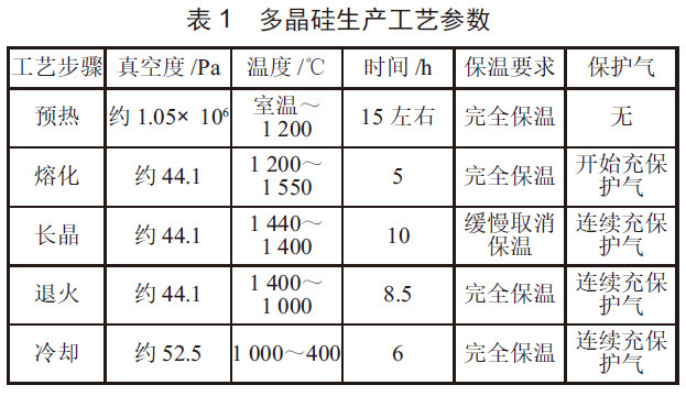 多晶硅鑄錠爐的生產工藝是將熱交換法和布里曼法進行了結合,硅在鑄錠爐內發(fā)生結晶,硅錠生產加熱過程中底部的隔熱層和爐的保溫層確保了嚴密的閉合狀態(tài),從而避免了硅錠生產熱量的外泄和溫度的不均衡造成的硅錠受熱不均衡,為硅錠長晶創(chuàng)造了良好的環(huán)境。當鑄錠爐內的硅錠出現(xiàn)結晶情況時,開始向爐內充入保護器,在保持熔融硅原料的坩堝位置不變的情況下將保溫層進行升高,這時保溫層與隔熱層之間會出現(xiàn)縫隙,坩堝底部的熱量便會通過這個空隙散發(fā)出去,爐壁和氣體這樣的熱量置換使得坩堝底部的溫度逐漸降低,已經完成結晶的材料便會從加熱區(qū)離開,但是熔融的硅液體卻不會離開,使得硅錠結晶過程中固體和液體的界面形成了較為穩(wěn)定的溫度梯度。鑄錠爐生產工藝的特點表現(xiàn)為液相溫度梯度與常數(shù)接近和硅錠生長速度可調節(jié)。鑄錠爐生產工藝加工既可以是方形的多晶硅材料也可以是大型硅錠。鑄錠爐多晶硅生產總體耗電量較低,且對于原料純度要求較為寬松,多晶硅的生產效率較高,而且使用這種硅片的電池太陽能轉換的效率也十分出色。在大規(guī)模工業(yè)化生產模式下,業(yè)內對多晶硅生產工藝流程和各個環(huán)節(jié)的參數(shù)進行了統(tǒng)一的規(guī)定。多晶硅的生產工藝可以分為預熱、熔化、長晶、退火和冷卻五個步驟,工藝參數(shù)如表1所示。