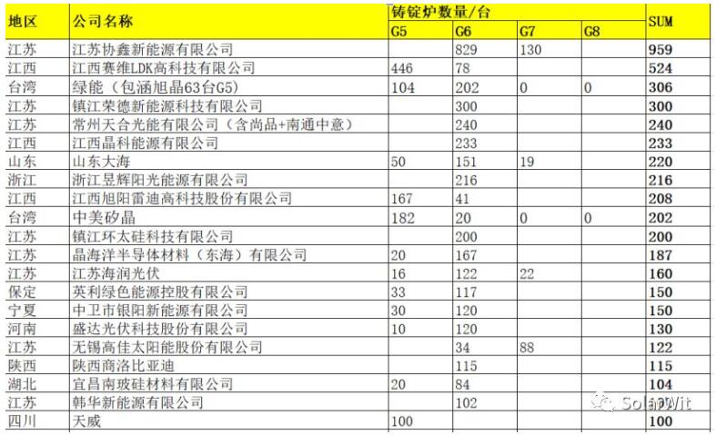 這張表只展現(xiàn)了多晶爐數(shù)量大于100臺(tái)的企業(yè),在我的整個(gè)數(shù)據(jù)庫(kù)中多晶鑄錠企業(yè)多達(dá)105家,合計(jì)7657臺(tái)多晶爐,這些爐子如果都滿產(chǎn)每個(gè)月至少可生產(chǎn)30億+張硅片,而目前全行業(yè)多晶硅片月產(chǎn)出只有8億片/月。多晶硅片的全行業(yè)開(kāi)工率不足三成。