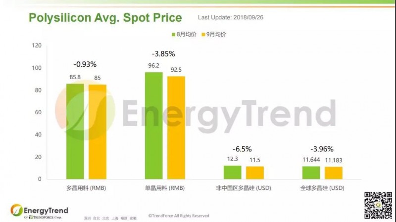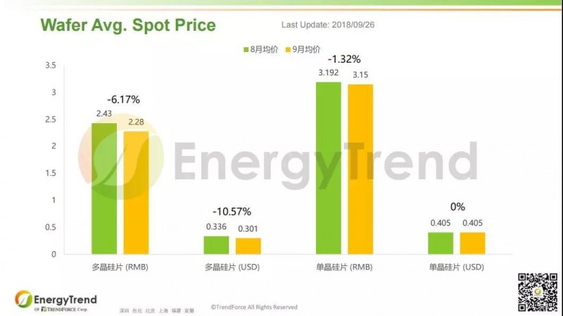 硅片環(huán)節(jié),多晶硅片的人民幣月均價(jià)為從8月的 RMB2.43/Pc 減少至9月的 RMB2.27/Pc,下跌幅度為 6.17%; 美金月均價(jià)為從8月的 US$0.336/Pc 減少至9月的 US$0.301/Pc,下滑幅度超過 10%。單晶硅片9月的人民幣月均價(jià)為 RMB3.15/Pc,比8月的 RMB3.192/Pc 稍有下滑;其美金月均價(jià)保持不變,8月、9月均為 US$0.405/Pc。