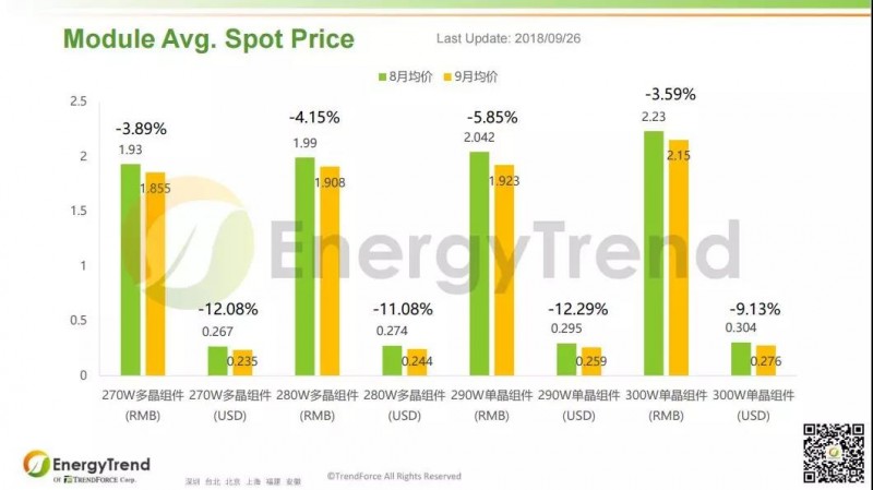 在組件端,海外市場比國內(nèi)市場動(dòng)靜更大。常規(guī)多晶組件人民幣本月月均價(jià)為 RMB1.855/W,比上月的 RMB1.93/W 有所下降,差值為每瓦 0.075元;美金月均價(jià)變動(dòng)較大,從 US$0.267/W 減少至 US$0.235/W,下跌幅度達(dá)到 12.08%。高效多晶組件人民幣9月均價(jià)為 RMB1.908/W,比8月均價(jià) RMB1.99/W 減少了 RMB0.082/W,跌幅為 4.15%;美金月均價(jià)從 US$0.274/W 掉到 US$0.244/W,跌幅為 11.08%。常規(guī)單晶組件9月均價(jià)為 RMB1.923/W,比前一月均價(jià) RMB2.042/W 略微減少了 RMB0.119/W;海外方面,常規(guī)單晶組件美金月均價(jià)變動(dòng)大,從 US$0.295/W 掉至 US$0.259/W,變化幅度為 12.29%。高效單晶組件9月人民幣均價(jià)為 RMB2.23/W,8月人民幣均價(jià)為 RMB2.15/W,稍有下滑;其美金月均價(jià)較人民幣月均價(jià)變動(dòng)略大,從 US$0.304/W 下跌至 US$0.276/W,跌幅超9%。