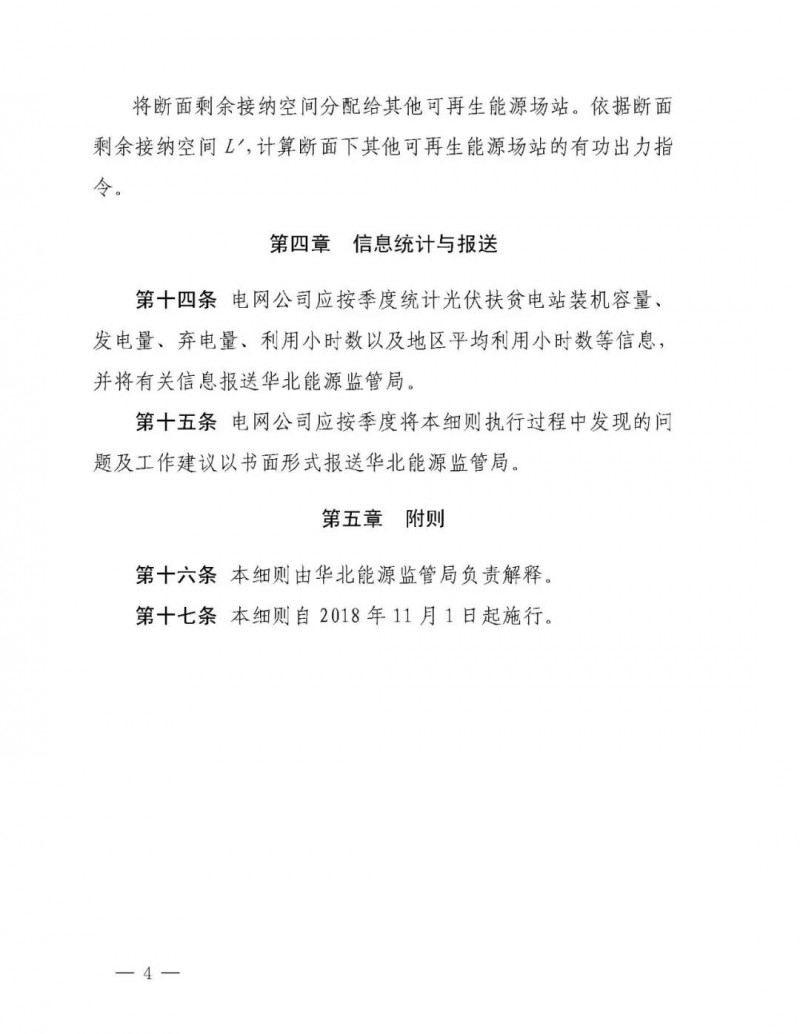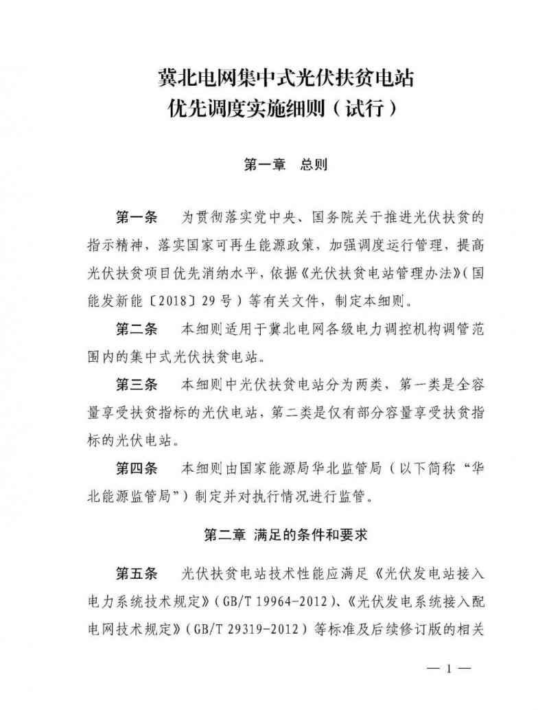 文件要求:華北電網(wǎng)有限公司,國網(wǎng)冀北電力有限公司,為貫徹黨中央、國務院關于打好扶貧攻堅戰(zhàn)的重要指示,積極落實光伏扶貧有關政策,進一步提高可再生能源消納水平,確保光伏扶貧項目電量優(yōu)先消納,國家能源局華北能源監(jiān)管局組織制定了《冀北電網(wǎng)集中式光伏扶貧電站優(yōu)先調(diào)度實施細則(試行)》。經(jīng)向有關電力企業(yè)征求意見,現(xiàn)予印發(fā),請相關單位于2018年11月1日起執(zhí)行。 執(zhí)行中如遇重大問題,請及時報告我局。