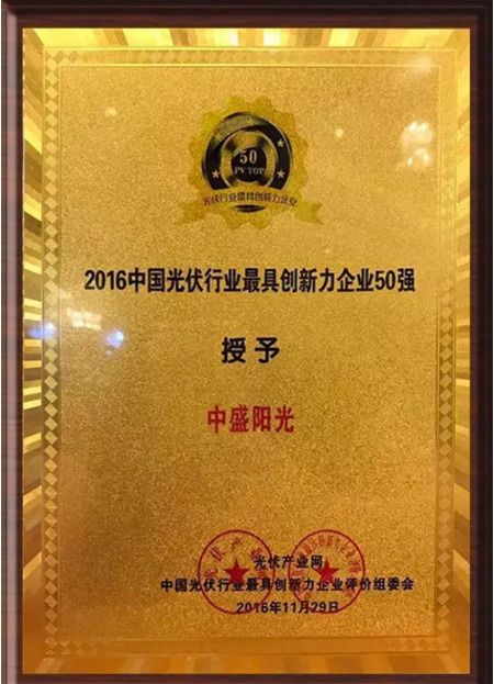 中盛從眾多候選企業(yè)中脫穎而出,榮膺“2016中國光伏行業(yè)十大品牌影響力企業(yè)”及“2016中國光伏行業(yè)最具創(chuàng)新力企業(yè)50強”。