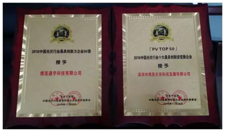 在2016年11月29日中國(guó)上海一個(gè)瑰麗璀璨之夜,由光伏產(chǎn)業(yè)網(wǎng)、中國(guó)智能產(chǎn)業(yè)聯(lián)盟主辦的“2016中國(guó)太陽(yáng)能光伏產(chǎn)業(yè)創(chuàng)新與發(fā)展高峰論壇”在這里隆重舉行。在參加會(huì)議的300多家光伏企業(yè)中,博亮通宇科技有限公司、深圳市博亮天安科技發(fā)展有限公司脫穎而出,雙雙獲獎(jiǎng)。博亮通宇憑借技術(shù)的持續(xù)創(chuàng)新和產(chǎn)品的質(zhì)量把控,一舉奪得“2016中國(guó)光伏行業(yè)最具創(chuàng)新力企業(yè)50強(qiáng)”。而博亮天安因逆變器的研發(fā)處于行業(yè)領(lǐng)先地位和擁有多項(xiàng)創(chuàng)新發(fā)明專(zhuān)利,斬獲“2016中國(guó)光伏行業(yè)十大最具創(chuàng)新逆變器企業(yè)”的榮譽(yù)稱(chēng)號(hào)。