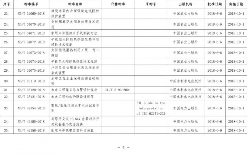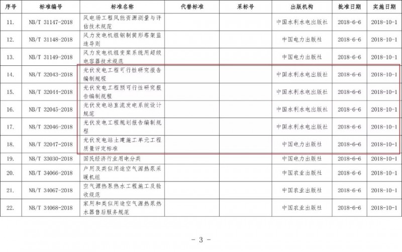 12月6日,國(guó)家能源局發(fā)布《國(guó)家能源局公告 2018年第8號(hào)》,公告表示經(jīng)審查,國(guó)家能源局批準(zhǔn)《光伏發(fā)電工程可行性研究報(bào)告編制規(guī)程》等87項(xiàng)行業(yè)標(biāo)準(zhǔn),其中能源標(biāo)準(zhǔn)(NB)47項(xiàng)、電力標(biāo)準(zhǔn)(DL)40項(xiàng),現(xiàn)予以發(fā)布。